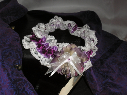 Используемые материалы: кружево, лента атласная, лента бархатная, текстильный цветок, лента из органзы, стразы, подвеска "Купидончик".
