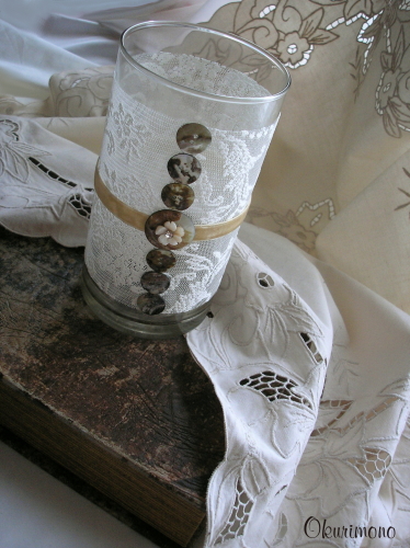 Подсвечник для большой свечи, с кружевом и перламутром. Может быть частью свадебного интерьера зала или комнаты молодожёнов.