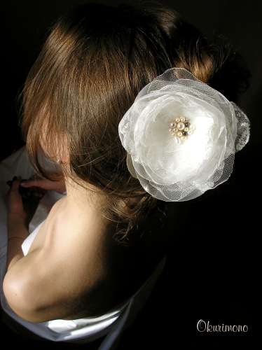 Используемые материалы: шифон, кружево, фатин, жемчуг натуральный речной, заколка-пеликан, органза, перья.