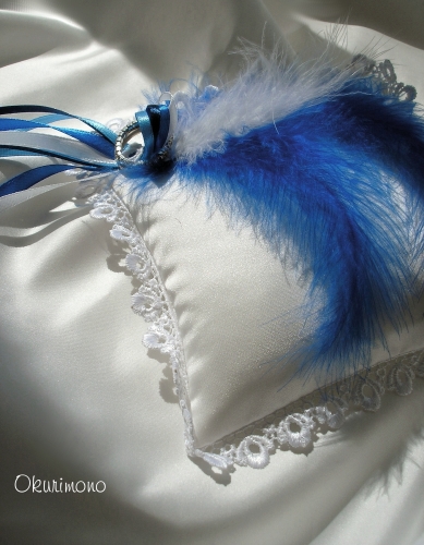 Используется на церемонии бракосочетания в ЗАГСе или в выездной церемонии. Обручальные кольца крепятся на ленточках. Размер подушечки: 14 x 14 см. Используемые материалы: шёлк, кружево, перья, атласные ленты, бисер.