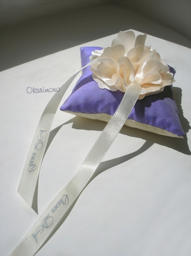 Подушечка для колец с цветком и именными лентами. Используется на церемонии бракосочетания в ЗАГСе или в выездной церемонии. Обручальные кольца крепятся на ленточках. Размер подушечки: 11 x 13.5 см. Используемые материалы: шёлк муаровый, тафта, атлас, атласная лента, наполнитель.
