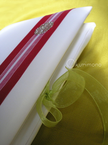 Используемые материалы: атлас, атласные ленты, ленты из органзы, металлический декоративный элемент.