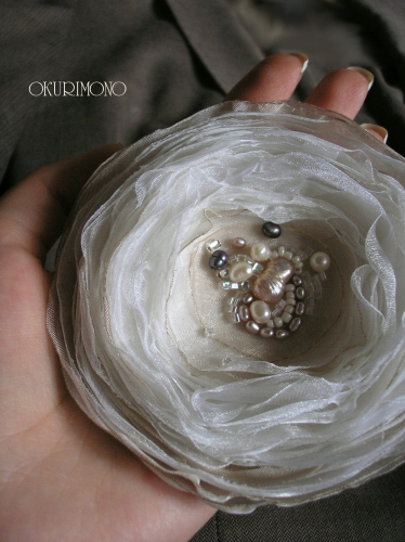 Многослойная нежная брошь из органзы трёх оттенков, украшенная жемчугом и бисером. Абсолютно универсальна, подойдёт и к костюмам, и к платьям, и к летним маечкам.