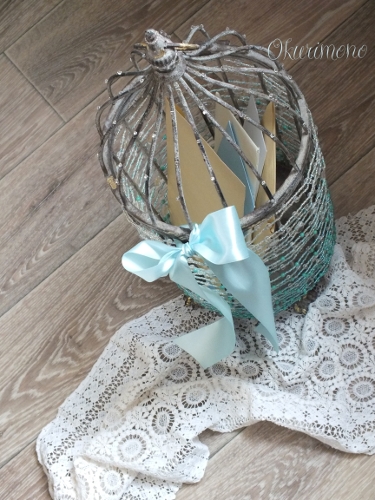 Шкатулка или, так называемый, сундучок для денежных подарков, в виде птичьей клетки. Нижняя часть клетки обтянута бисером и различными бусинами, с переходом цвета от насыщенного бирюзового до прозрачного. Помимо декоративной функции, они не дают конвертикам выпасть наружу. Сами конверты можно опустить в клетку через верхнюю её часть, которая остаётся свободной. Чтобы достать содержимое, нужно открыть замочек и откинуть верхнюю часть клетки. Для надёжности, на замочек завязывается декоративный бант. Клетка декорирована золотой поталью.