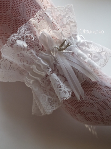 Используемые материалы: ленты атласные, кружево, стеклянная подвеска "Сердце", металлическая подвеска "Птичка".