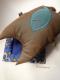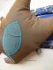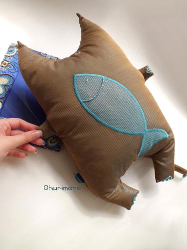 Котик в переливающейся, медно-голубой шкурке, с бубенчиком и бусинами на хвосте и бирюзовой рыбкой на животе :) Не против послужить хозяину подушкой, как дома, так и в дороге. Размер от лап до кончиков ушей: 43 x 33 см. Используемые материалы: текстиль, декоративные глазки, бубенчик, стеклянные бусины, бисер, наполнитель.