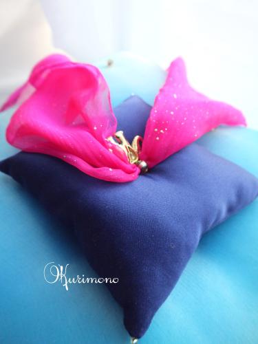 Большая необычная подушка для обручальных колец. Подушка состоит из трёх ярусов. Кольца крепятся на самой маленькой подушечке, при помощи шёлковой ленты. Так как концепция свадьбы - цирк Du Soleil, по углам подушки предусмотрены петли для канатов, по которым она должна опускаться к молодожёнам, из-под купола.