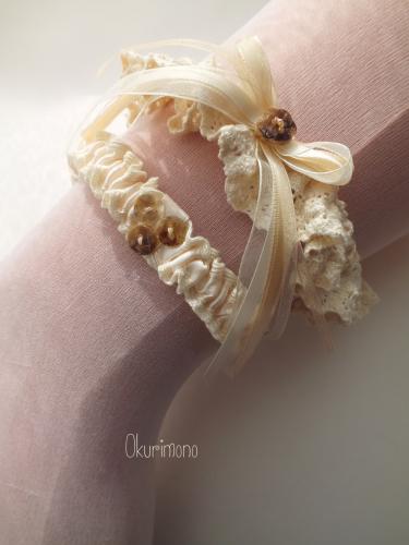 Используемые материалы: ленты атласные, хлопковое кружево, хлопковая лента, ленты из органзы, перламутр, жемчуг натуральный(речной).
