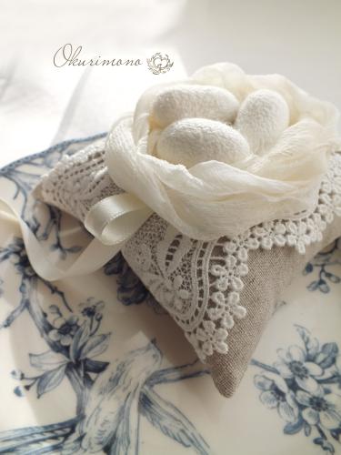 Используемые материалы: лён, шифон, кружево, атласные ленты, коконы шелкопряда, фарфоровые бусины, наполнитель.