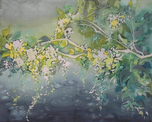 "Ветка акации над водой". Шифон, анилин. 47x39