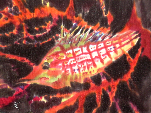 "Красная рыба в красных коралах". Хлопок, анилин. 36x48