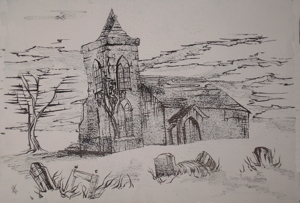 "Заброшенная церковь". Крашенная бумага, тушь. 30x42