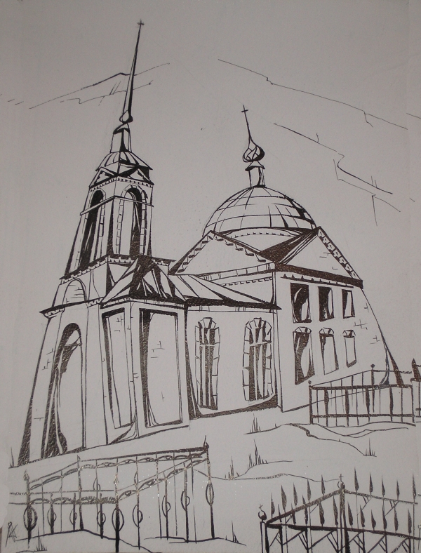 "Церковное кладбище". Крашенная бумага, тушь. 30x42